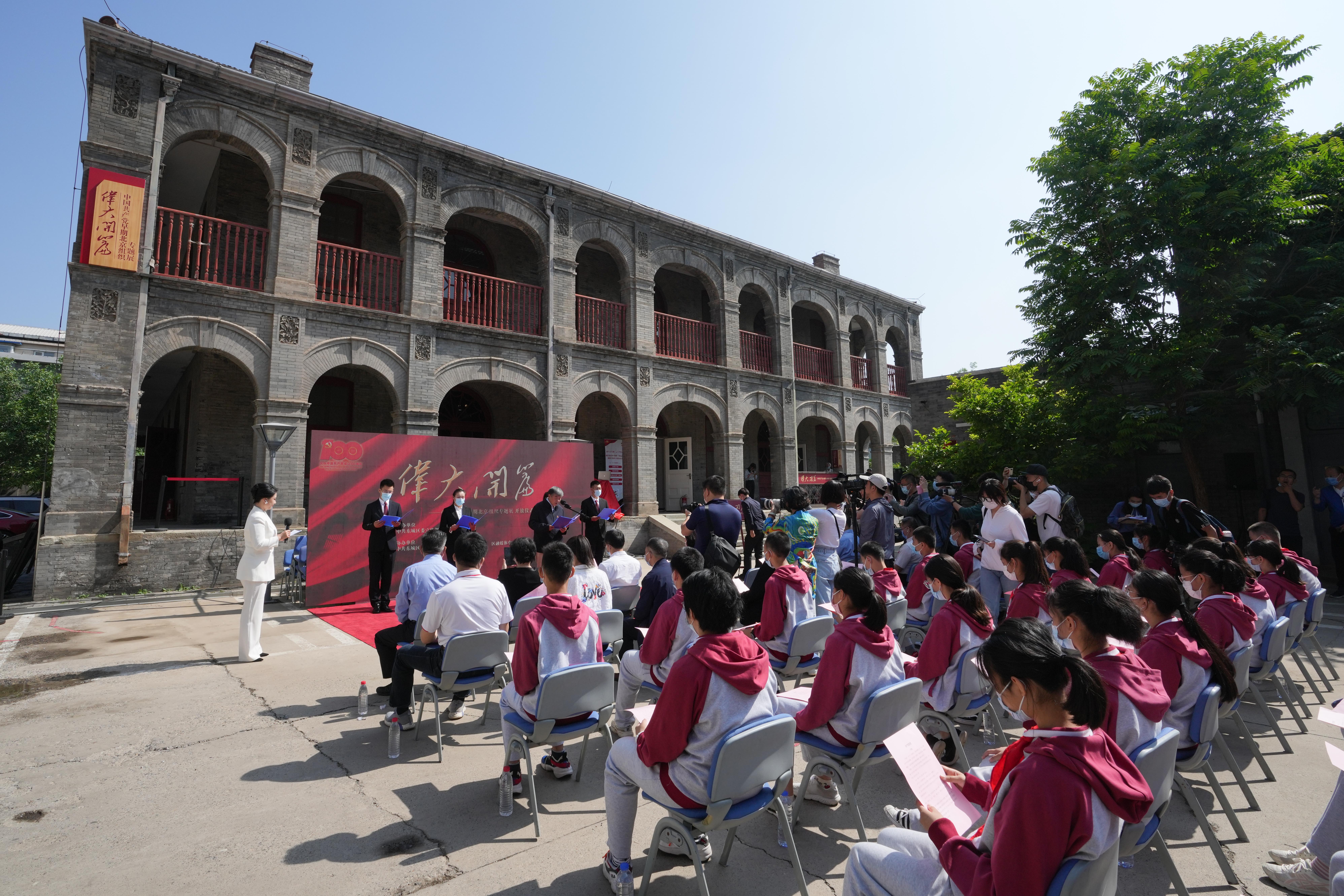 6月1日,在北大二院旧址(原北大数学系楼)前,北京市第二十七中学的学生在“伟大开篇——中国共产党早期北京组织专题展”开幕仪式上诵读《共产党宣言》(节选)。新华社记者 鞠焕宗 摄