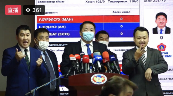 △蒙古国总选举委员会主席德勒格尔那仁9日晚在新闻发布会上宣布该国2021年总统选举投票初步结果(图片来源:蒙古国总选举委员会官网)