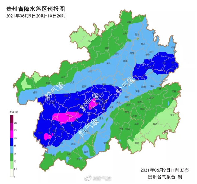 贵州省气象台6月9日21时发布暴雨蓝色预警信号:未来12小时,贵州省中西部及东北部降雨量将达50毫米以上,部分乡镇超100毫米,注意防范!