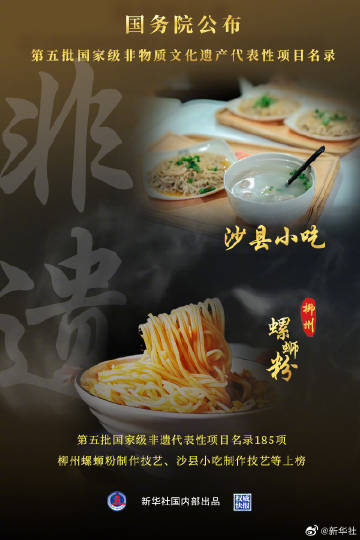 【#权威快报#|#第五批国家级非遗名录公布#柳州螺蛳粉、沙县小吃等上榜】国务院公布第五批国家级非物质文化遗产代表性项目名录共185项,柳州螺蛳粉制作技艺、沙县小吃制作技艺等上榜。截至目前,国务院共公布国家级非遗代表性项目名录1557项。(记者周玮、余俊杰,海报设计张晨光)