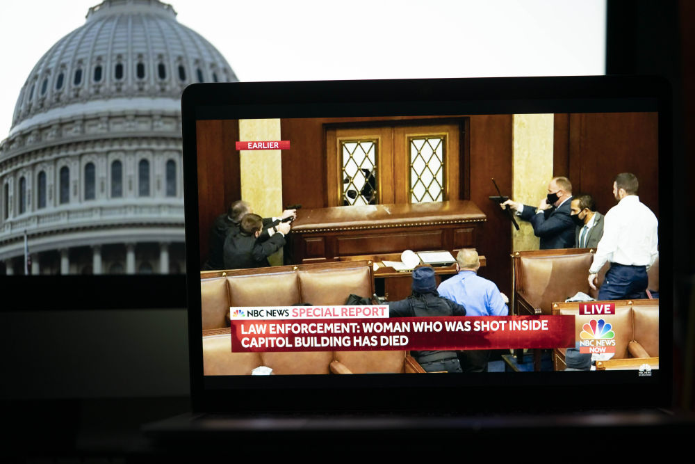 1月6日,美国国会遭暴力冲击,认证大选结果联席会议被迫中断。图为当天拍摄的电视画面,显示美国华盛顿国会大厦内的工作人员应对闯入者。(新华社记者刘杰摄)