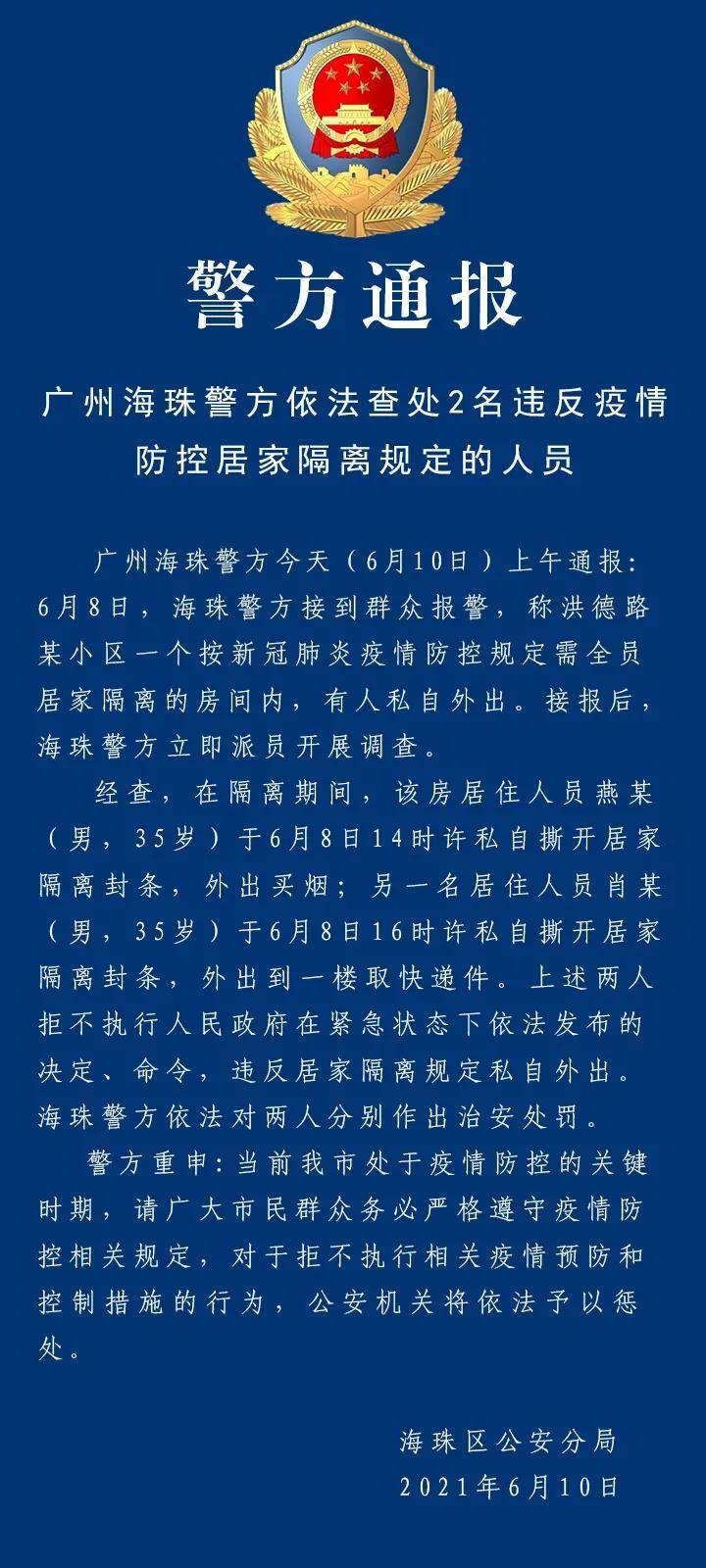 广州海珠警方依法查处2名违反疫情防控居家隔离规定的人员