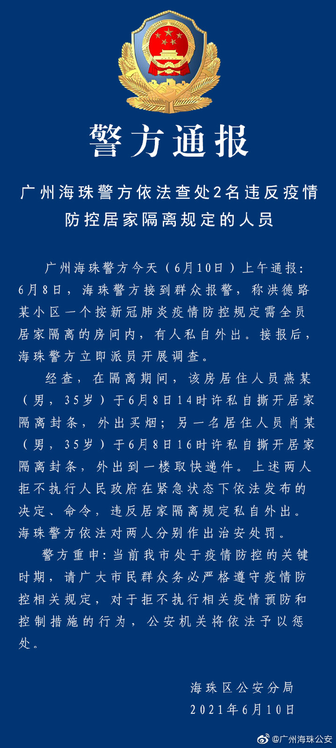 广州海珠警方今天(6月10日)上午通报:6月8日,海珠警方接到群众报警,称洪德路某小区一个按新冠肺炎疫情防控规定需全员居家隔离的房间内,有人私自外出。接报后,海珠警方立即派员开展调查。