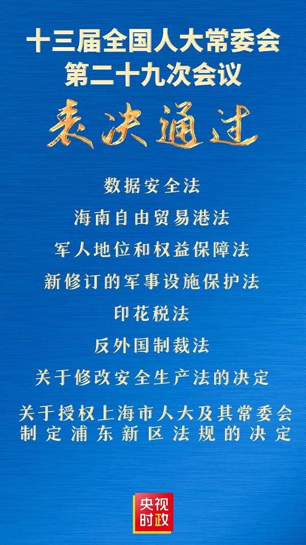 十三届全国人大常委会第二十九次会议表决通过多项法案及两项决定
