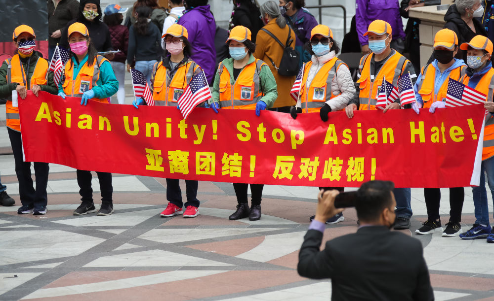 5月15日,华裔社区代表在美国奥克兰举行的“种族平权、反对歧视亚太裔”大型集会活动上展示横幅。新华社发(董旭东摄)