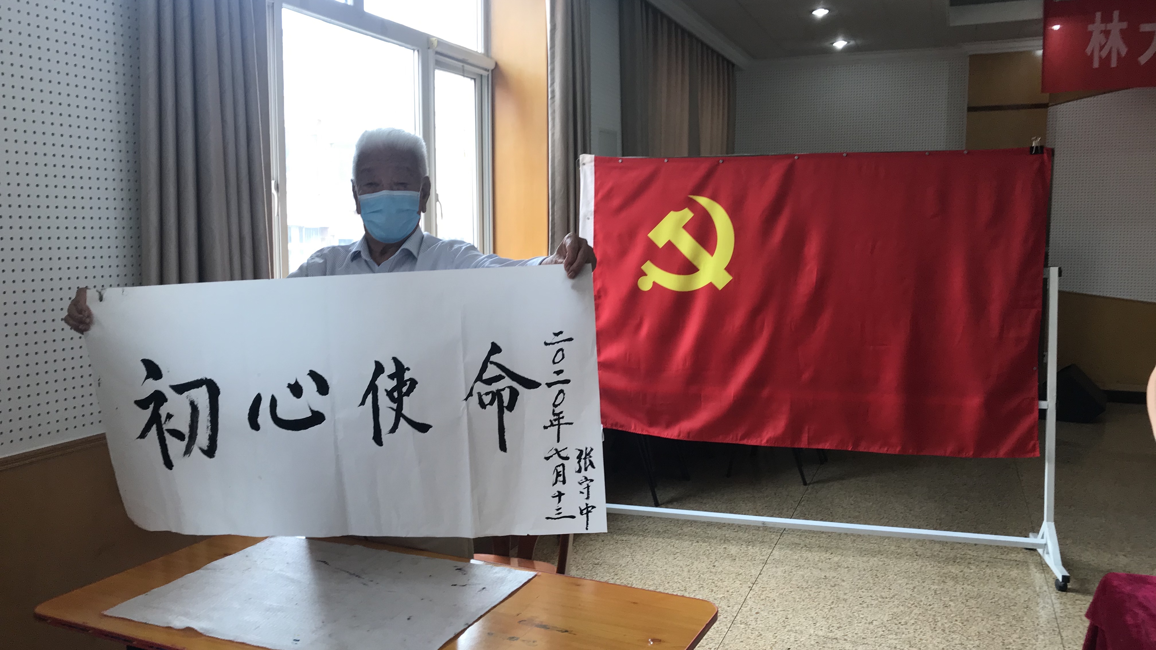 “我最大的愿望,就是在有生之年,在党的红旗下,宣读入党誓言,做一名光荣的共产党员。”去年7月13日,在北京海淀区学院路街道北京林业大学社区居委会召开的第二党支部预备党员转正大会上,党支部大会全票通过张守中同志按期转为中国共产党正式党员。在大会现场,梦想成真的张守中,抑制不住内心激动,提起毛笔写下“初心使命”四个大字。