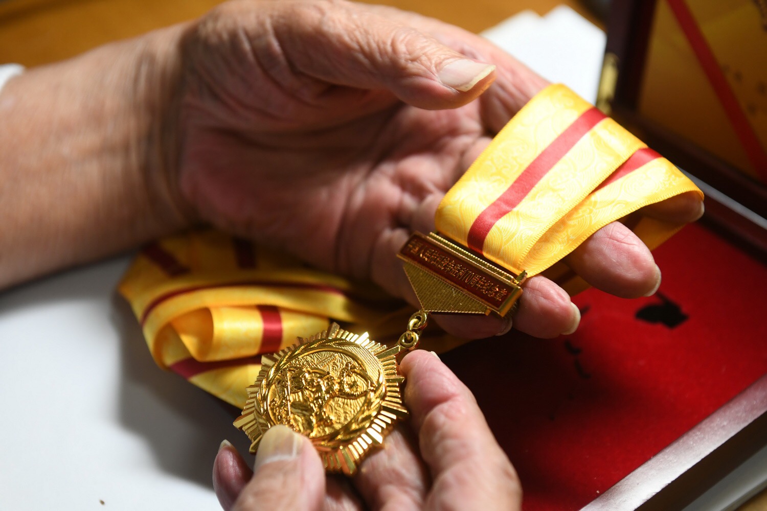张守中看着自己获得的中国人民抗日战争胜利70周年纪念章。受访者供图