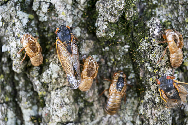 5月18日在美国弗吉尼亚州阿灵顿拍摄的17年蝉和蝉蜕。(新华社记者刘杰摄)