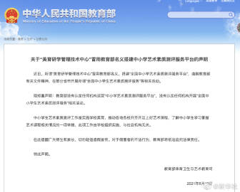 【#教育部声明中小学生艺术素质测评与社会机构无关#】教育部10日发布声明称,近日,所谓“美育研学管理技术中心”冒用教育部名义,曲解教育部有关文件精神,在部分省市开展所谓“全国中小学生艺术素质测评服务”等相关活动。教育部声明表示,教育部没有认定任何机构运营“中小学艺术素质测评服务平台”,没有认定任何机构开展“全国中小学生艺术素质测评服务”相关活动。中小学生艺术素质测评工作由学校组织实施,与社会机构无关。教育部提醒广大师生和家长,切勿轻信虚假宣传。(记者胡浩)