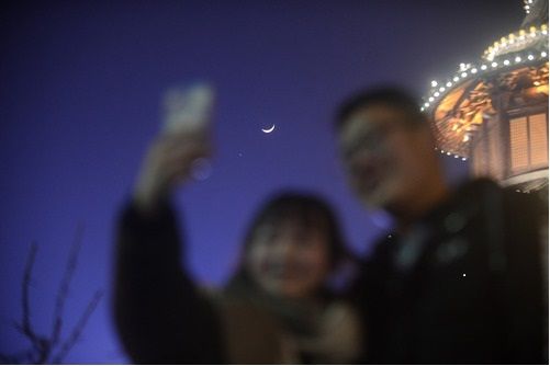 2017年1月2日傍晚,江苏扬州市民在文昌阁下合影,夜空中上演“金星合月”天象。(新华社发)