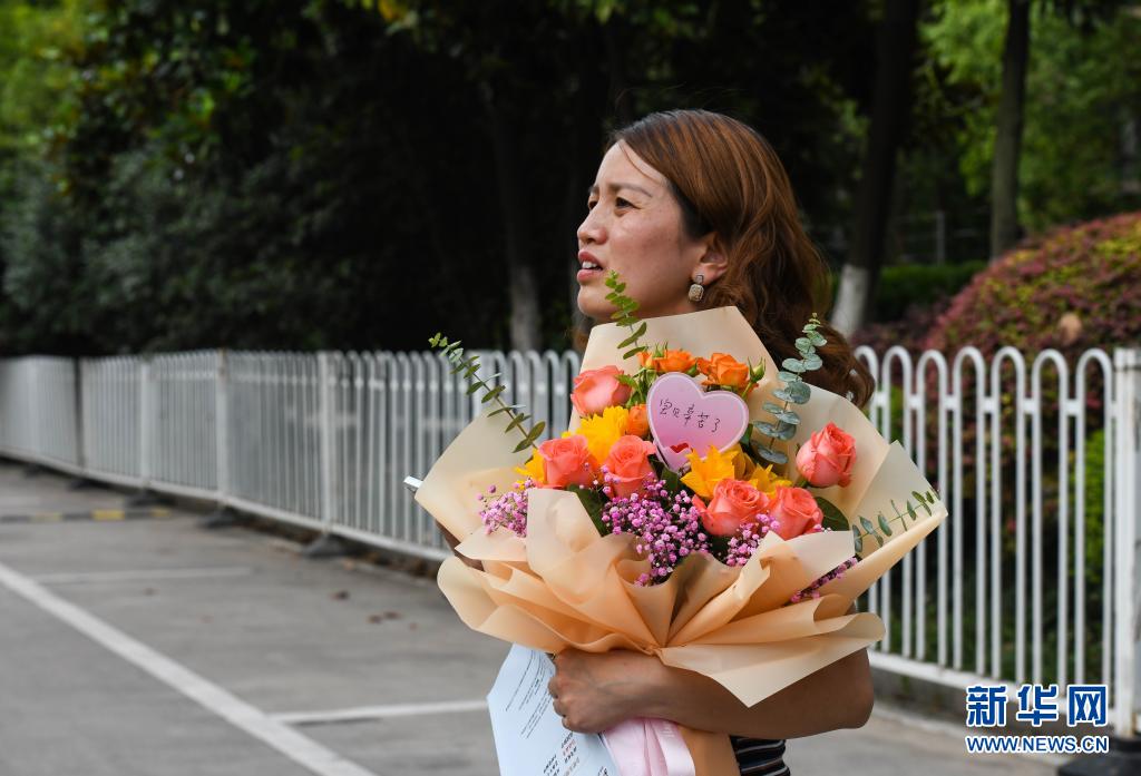 一位考生家长在给孩子送的花束贺卡上写下