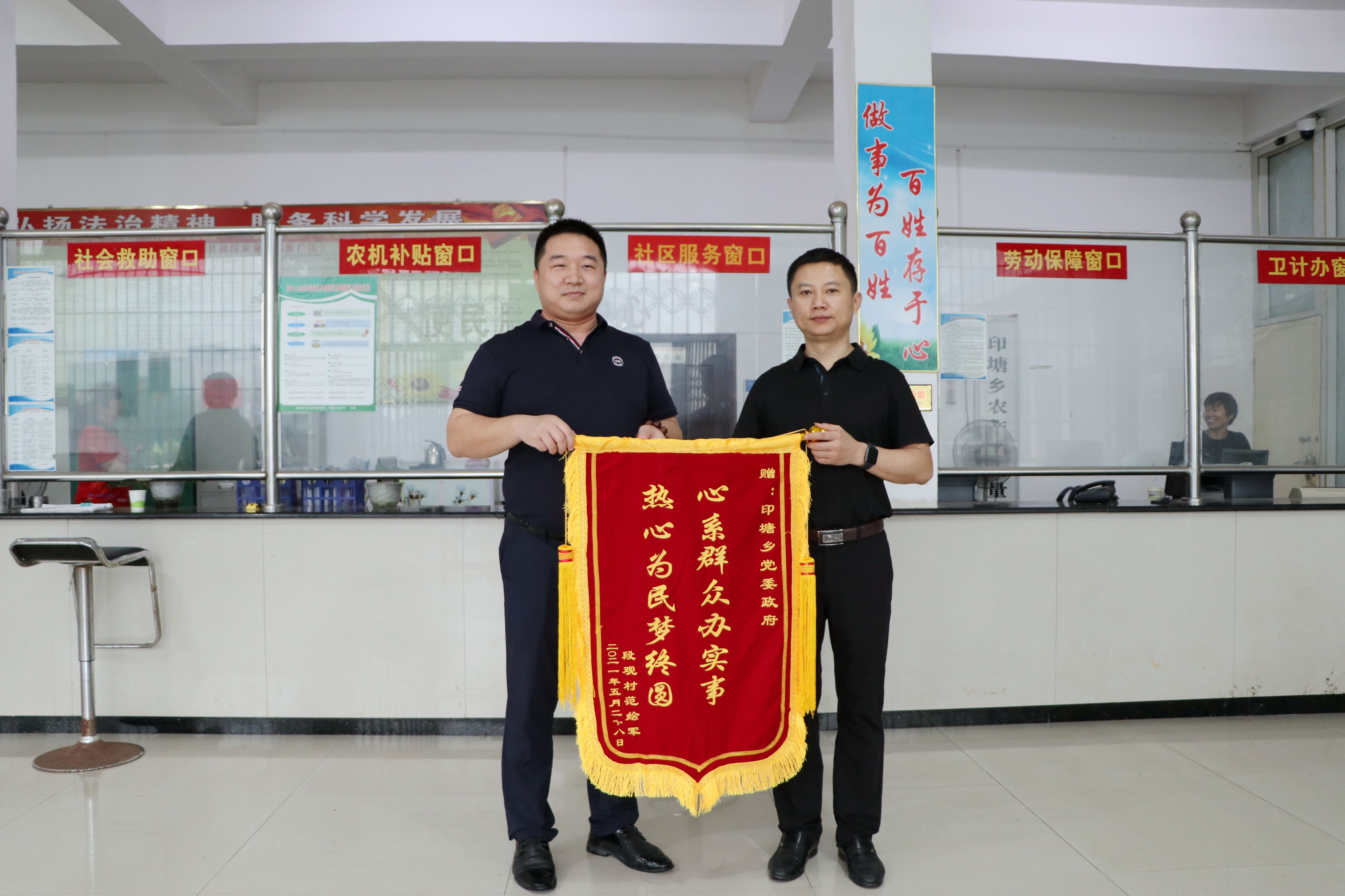 6月10日,范绘军(左)将绣有“心系群众办实事 热心为民梦终圆”的锦旗送至印塘乡政府。(王斌摄)
