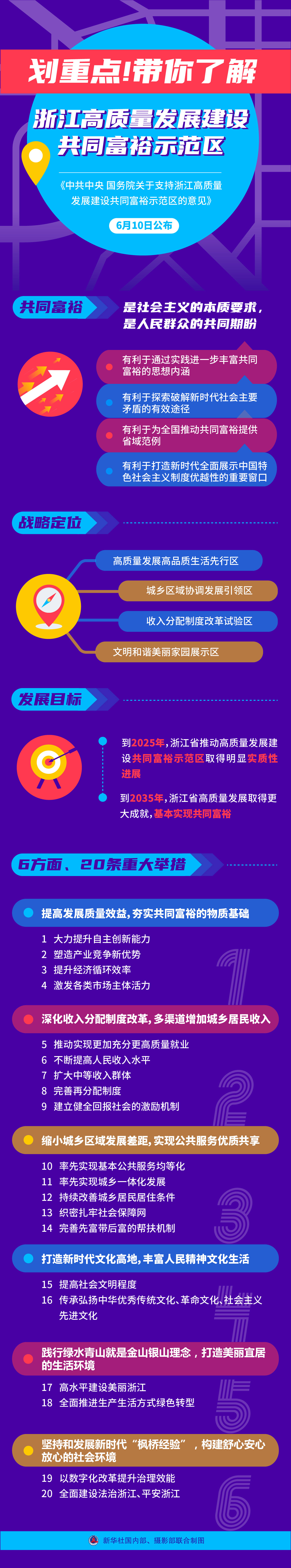 《中共中央 国务院关于支持浙江高质量发展建设共同富裕示范区的意见》10日发布。共同富裕示范区有哪些亮点?提出了哪些重大任务?如何让共同富裕看得见、摸得着、真实可感?打开这张图,带你了解浙江高质量发展建设共同富裕示范区。(记者谢希瑶、安蓓,制图陈为)