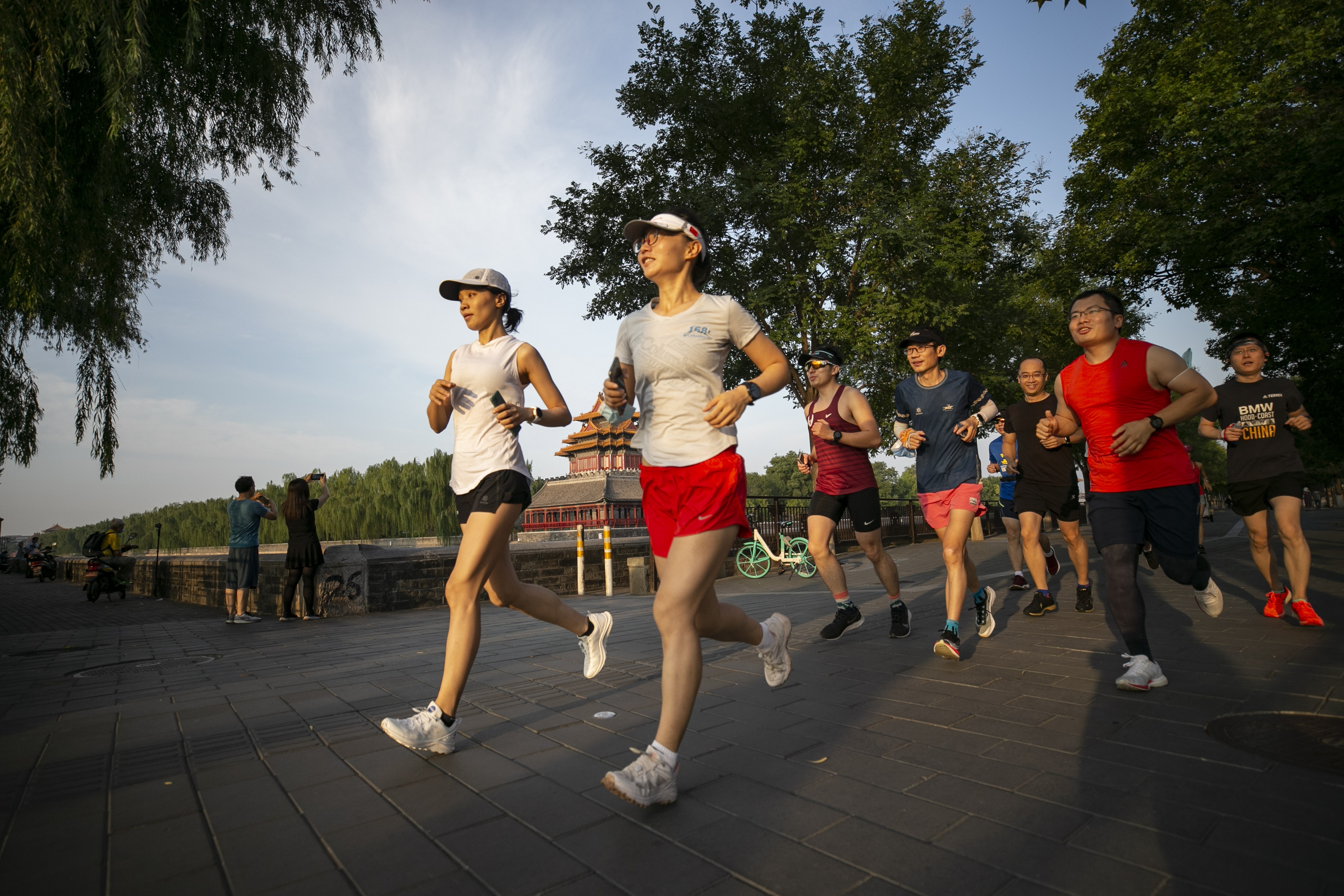 北京市民在北京故宫角楼附近参加晨跑。新华社记者李明摄
