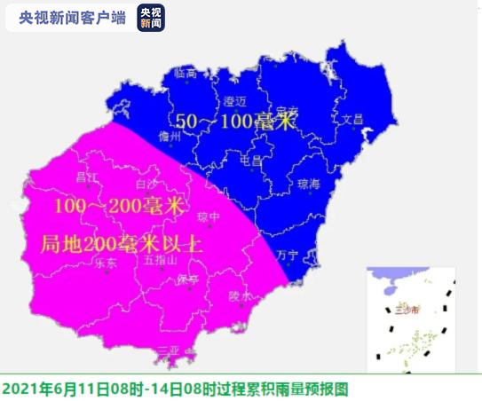海南省气象台预计,6月11日—13日,海南全岛有较强降水。其中,11日,海南全岛有阵雨或雷阵雨,东半部局地大到暴雨;12日—13日,海南岛南部、中部和西部地区有大到暴雨,局地大暴雨,北部和东部地区有中到大雨、局地暴雨。6月11日08时—14日08时各地过程雨量:三亚、陵水、保亭、五指山、乐东、东方、昌江、白沙和琼中等市县100~200毫米,局地200毫米以上;儋州、临高、澄迈、屯昌、海口、定安、文昌、琼海和万宁等市县50~100毫米。