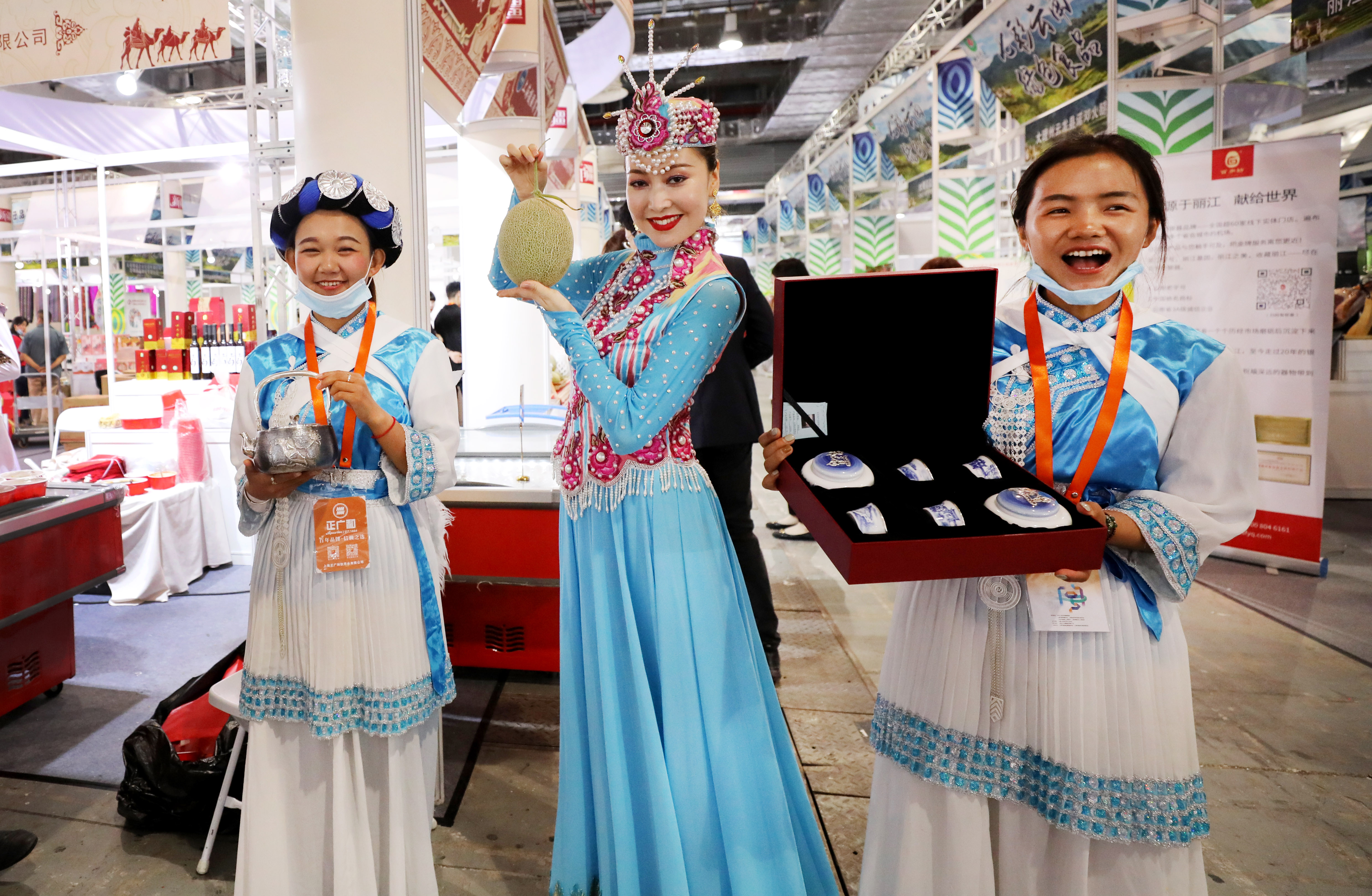 5月29日,2021中华老字号博览会在沪举行,图为工作人员现场手持各自企业的特色产品。新华社记者 方喆 摄