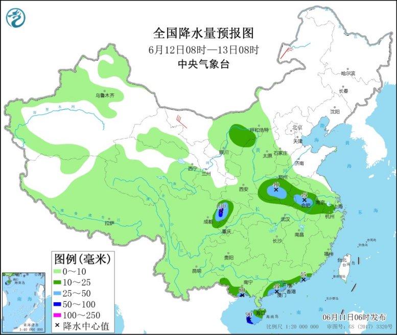 预计今天(6月11日)全国降雨都有所减弱,但明后天南方新一轮降雨又将再度发展,江汉、江淮、江南东北部等地有中到大雨,局地暴雨。