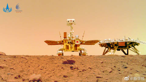 【权威快报|#天问一号着陆火星首批科学影像图公布#】6月11日,国家航天局公布了由祝融号火星车拍摄的着陆点全景、火星地形地貌、“中国印迹”和“着巡合影”等影像图。首批科学影像图的发布,标志着#我国首次火星探测任务取得圆满成功#。(记者胡喆)