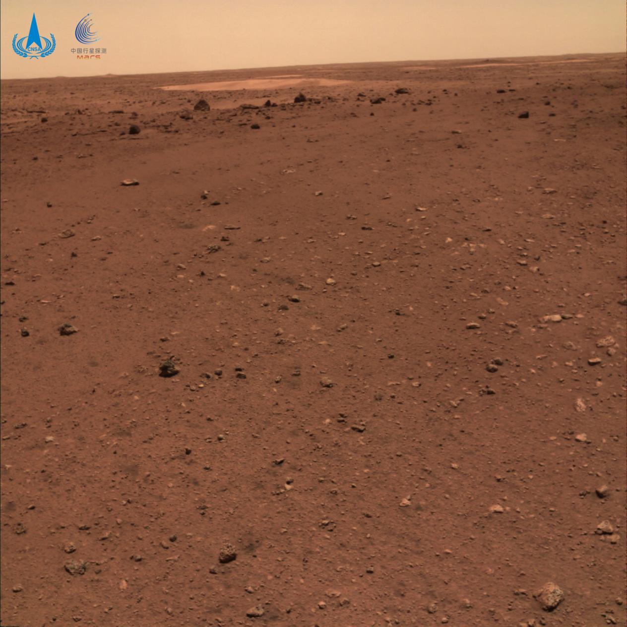 着陆点全景图,是火星车尚未驶离着陆平台时,由火星车桅杆上的导航地形相机,进行360°环拍,经过校正和镶嵌拼接而成。图像显示,着陆点附近地势平坦,远处可见火星地平线,石块丰度和尺寸与预期一致,表明着陆点自主选择和悬停避障实施效果良好。