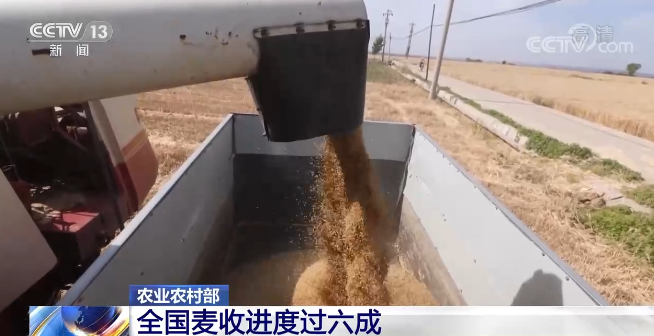 央视网消息:农业农村部昨天(6月10日)发布,全国麦收进度过六成,机收比例超过98%。
