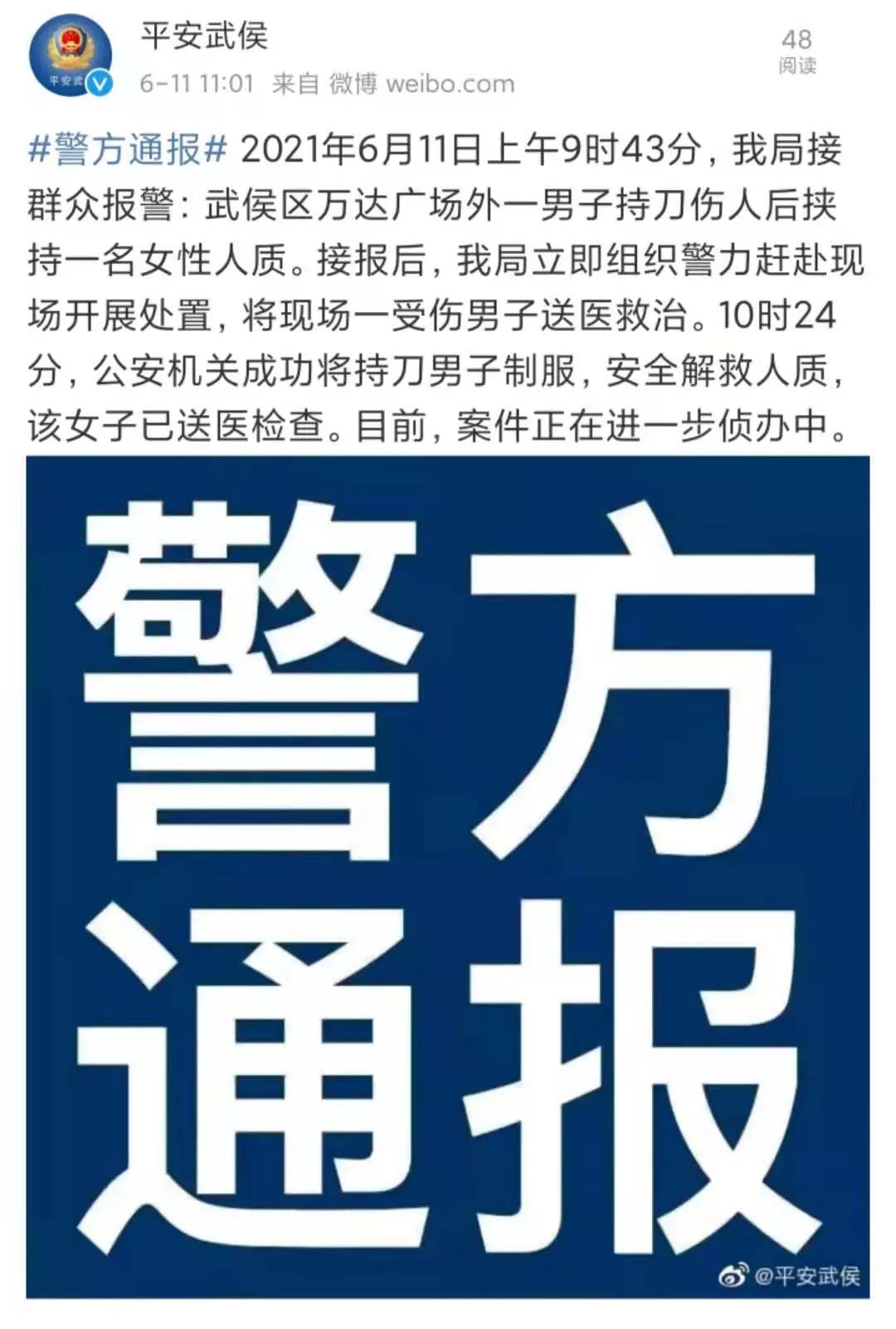 据“平安武侯”消息,今天(6月11日)9时43分,成都公安局武侯分局接群众报警,武侯区万达广场外一男子持刀伤人后挟持一名女性人质。