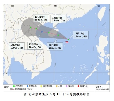 海南省气象台预计,该低压将以每小时20公里左右的速度向西偏北方向移动,强度略有增强。并可能于11日夜间到12日白天在海南岛东部沿海地区登陆,12日夜间进入北部湾海面。11日至13日海南岛将有一次强风雨过程。