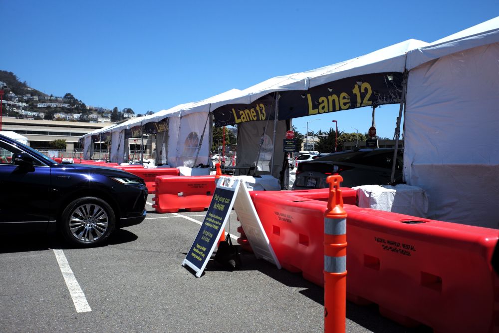 2021年5月22日,在美国加利福尼亚州旧金山城市学院的新冠疫苗接种点,市民通过“得来速”的方式不下车接种疫苗。新华社记者 吴晓凌 摄