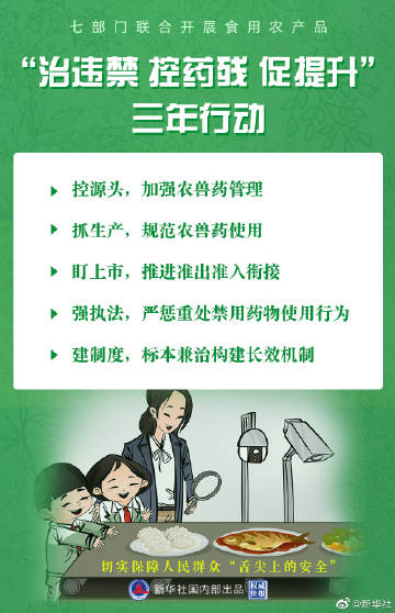 【#权威快报#|七部门实施食用农产品“治违禁 控药残 促提升”行动】2021年6月至2024年6月,农业农村部、市场监管总局、公安部、最高人民法院、最高人民检察院、工业和信息化部、国家卫生健康委在全国联合实施食用农产品“治违禁 控药残 促提升”三年行动。针对禁限用农药、食品动物禁止使用的药品及其他化合物、产蛋期不得使用兽药、停用兽药使用问题以及常规农兽药残留超标问题,全国集中治理11个问题突出品种,各地可根据生产实际和监测情况增加治理品种。力争用3年左右时间,生产方式进一步转型升级,绿色防控技术得到普遍应用,农药兽药使用更加科学合理,违法使用禁限用药物问题基本解决,常规农兽药残留超标问题有效遏制,生产销售的食用农产品符合食品安全国家标准,属地责任、监管责任、生产经营者主体责任进一步落实。(记者于文静、胡璐;海报设计肖循)