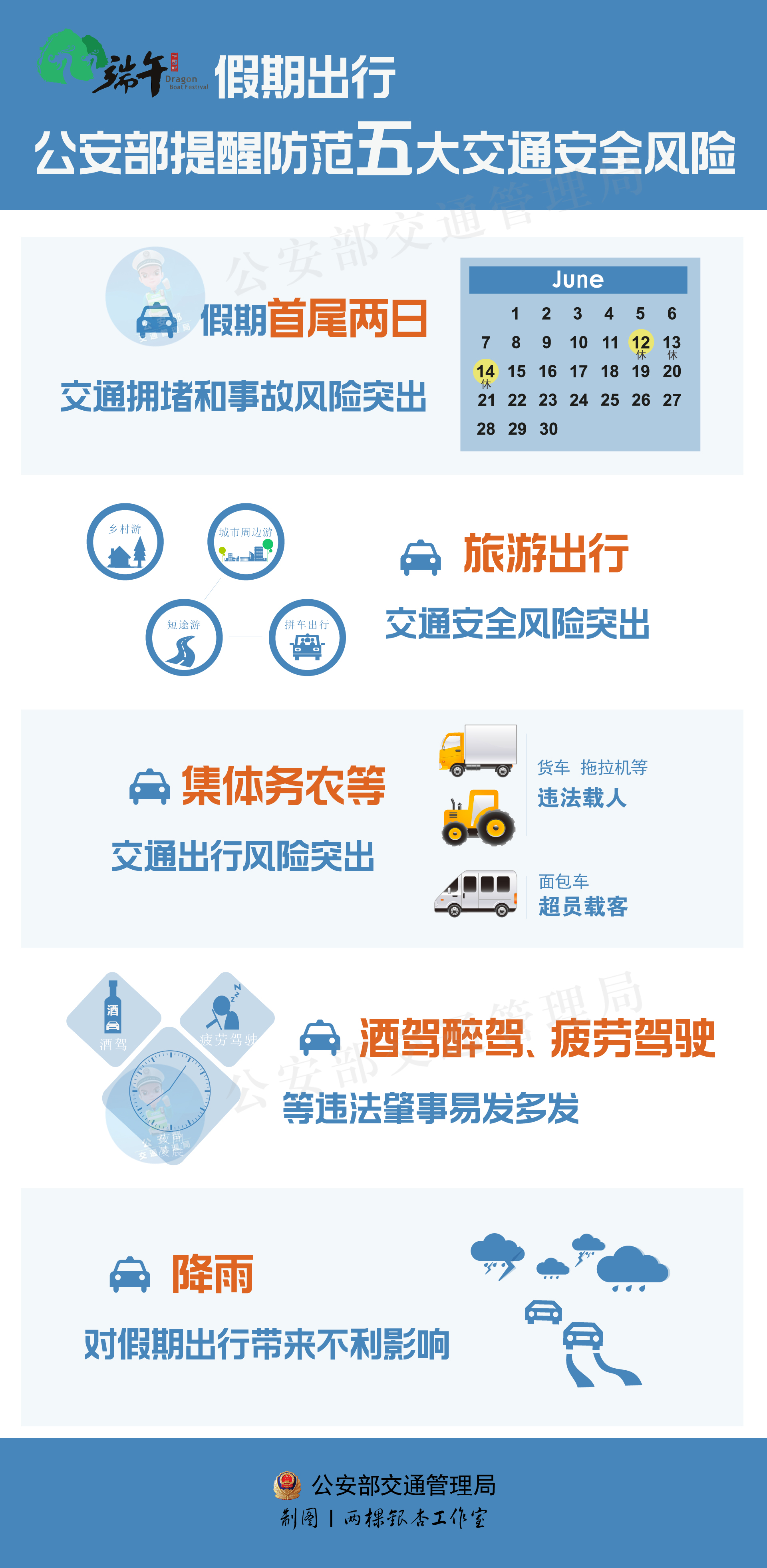 为确保端午节假期道路交通安全,公安部交通管理局11日公布一批近期及往年端午节假期典型交通事故案例,提示广大驾驶人和假日出行群众知险避险,平安出行,欢度假期。