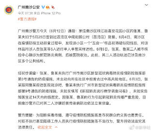 【#广州南沙夫妇涉嫌妨害传染病防治被立案侦查#】广州南沙警方12日对外通报,广州南沙区二人因涉嫌妨害传染病防治被依法立案侦查。