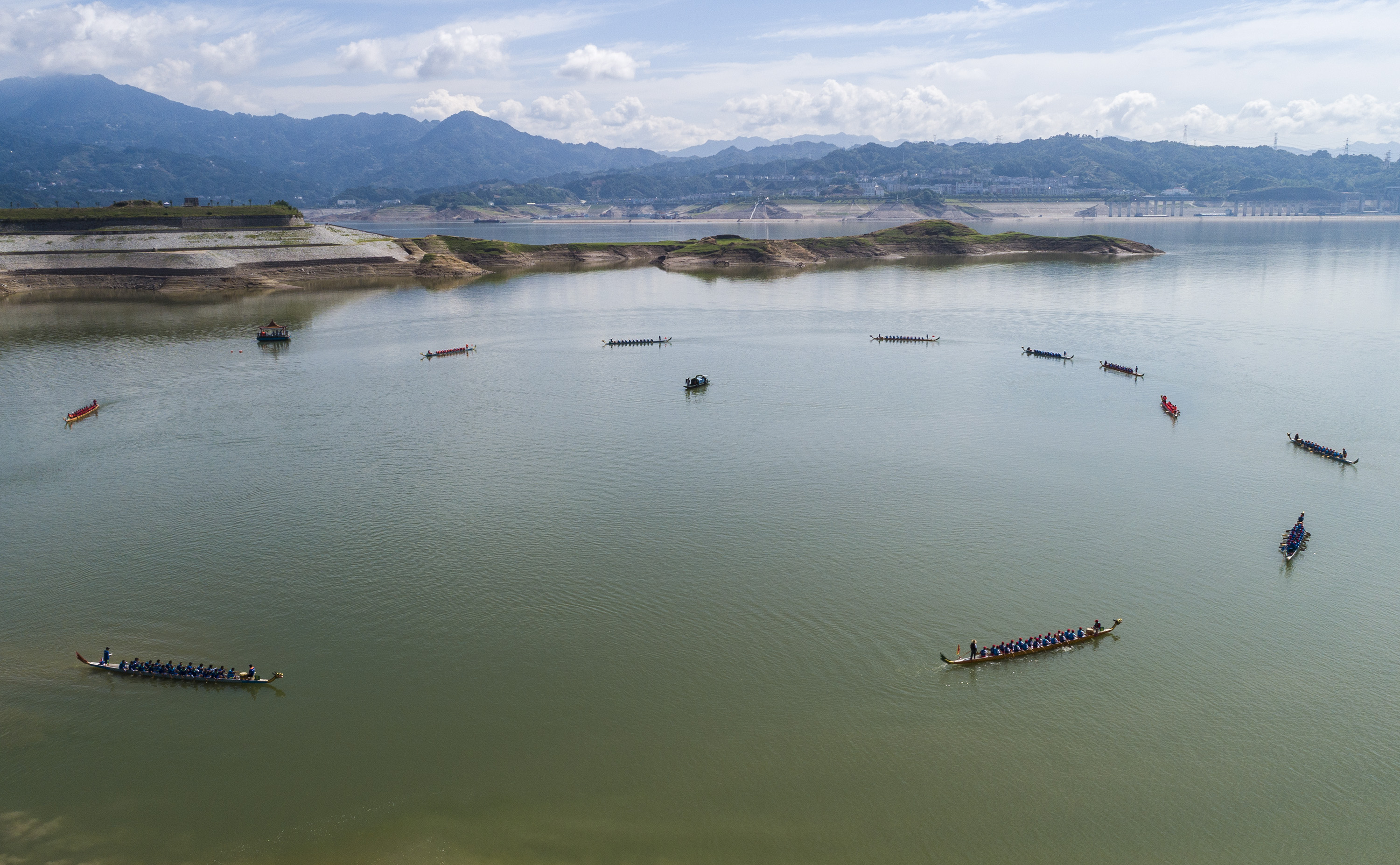 ↑在三峡库区秭归县县城徐家冲水域拍摄的纪念爱国诗人屈原的仪式(无人机拍摄)。新华社发(郑家裕摄)