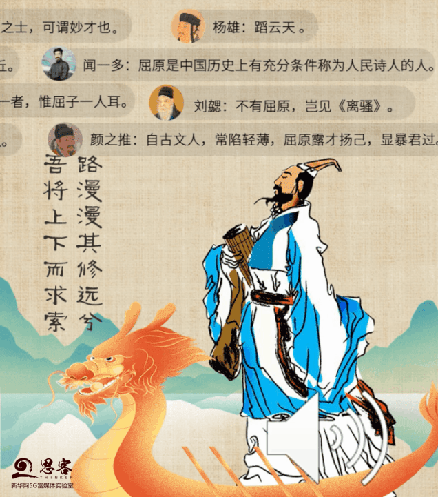 时至今日,屈原以其清高孤绝的秉性,正道直行的品格,浪漫华彩的想象,爱国忧思的情怀,影响了贾谊、司马迁,影响了陶渊明、李白,影响了苏轼、辛弃疾,也影响了梁启超、闻一多……实际上是影响了世世代代中国人,影响了中国文学,影响了中国文化,也继续影响着当代中国。