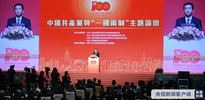 6月12日,由中央政府驻港联络办、驻港国安公署、外交公署、驻港部队联合主办,香港特区政府特邀主办的“中国共产党与‘一国两制’主题论坛”在香港会议展览中心举行,隆重庆祝中国共产党成立100周年。香港中联办主任骆惠宁出席并发表主旨演讲。全国政协副主席董建华、梁振英,香港特区行政长官林郑月娥,以及中央驻港机构负责人,特区行政、立法、司法机构代表,港区全国人大代表、全国政协委员,社会各界人士等共650余人参加。