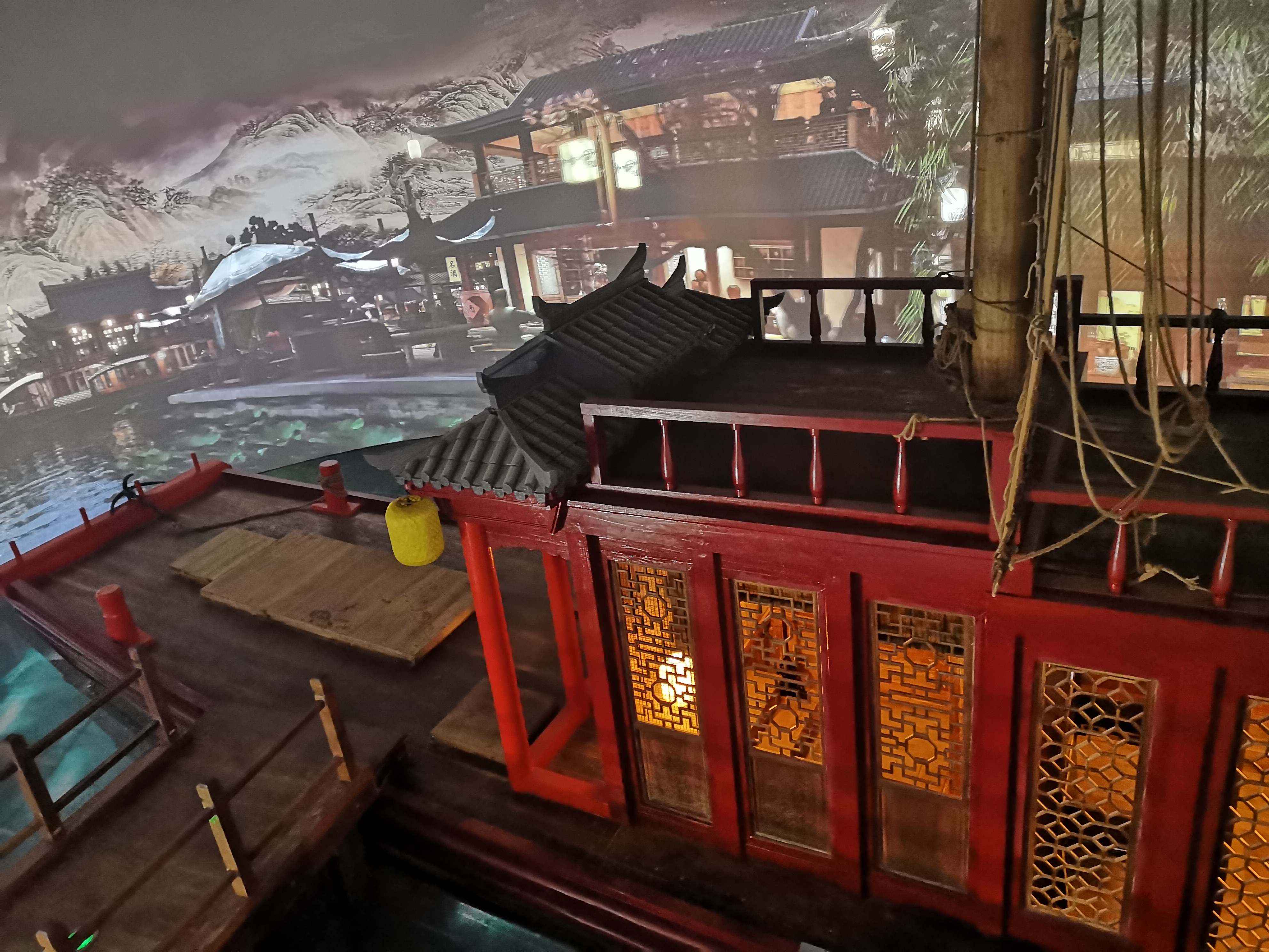 此外,参观者还可以登上一艘长约21米、桅杆高15米的“沙飞船”,在四周投影的带动下,模拟坐船扬帆远行,感受两岸的繁华盛景。相传“沙飞船”是扬州沙氏所造,因跑得快而得名。它是明清时期江南一带的大户人家娶亲或看戏常用的交通工具,也是康熙南巡、乾隆南巡时的御座船之一。