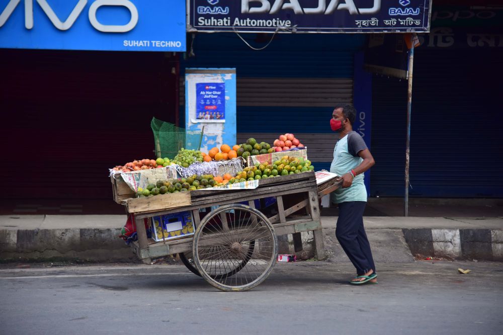 6月8日,戴着口罩的商贩推车走在印度阿萨姆邦瑙贡的街道上。印度卫生部8日发布的数据显示,自4月5日以来,印度单日新增新冠确诊病例首次在8日降至10万例以下。印度专家认为,由于过去两周日增确诊病例稳步下降,印度第二波疫情正显现放缓迹象。(新华社发)