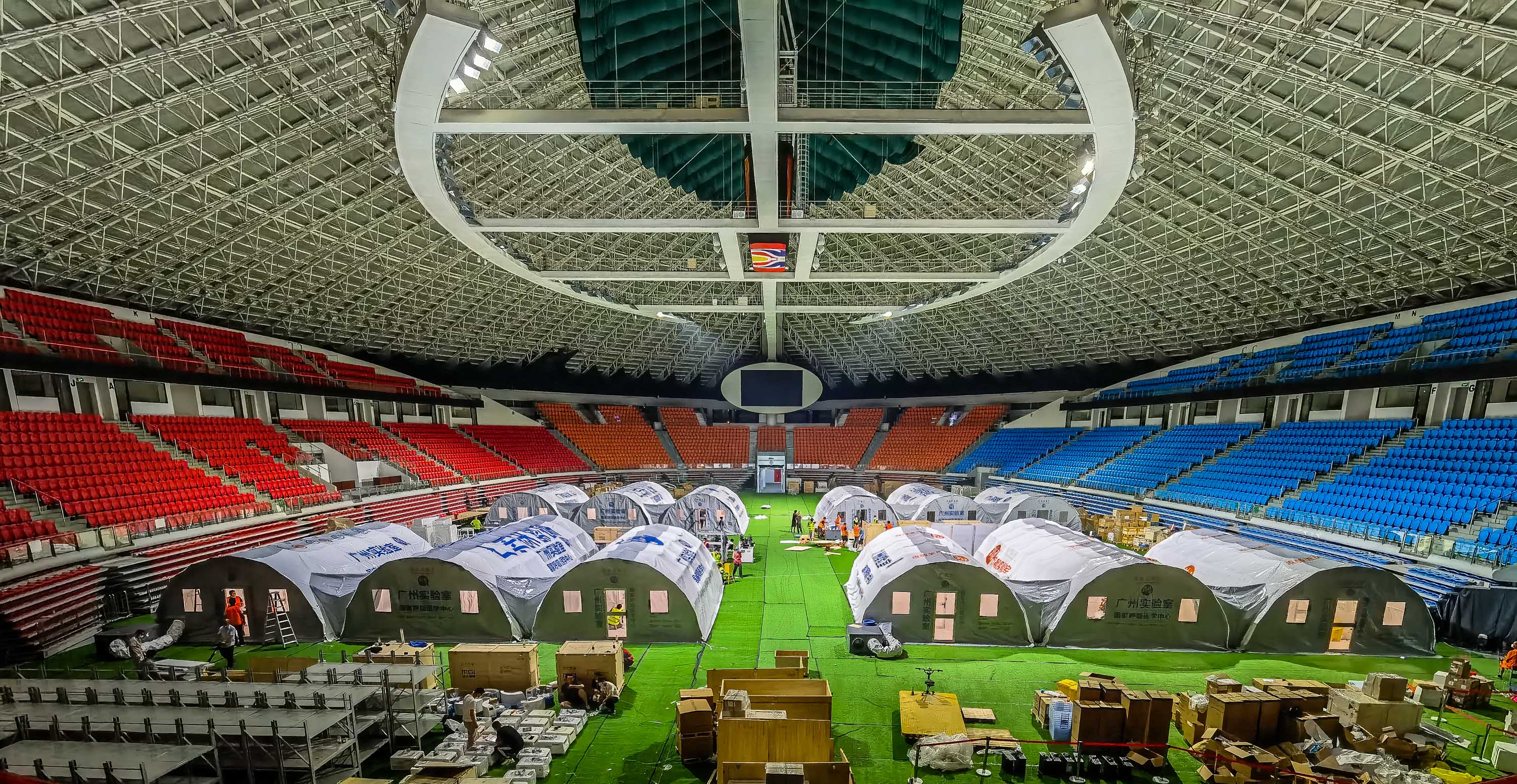 6月2日凌晨,四组“猎鹰号”气膜方舱实验室在广州体育馆搭建完成,这是自2020年新冠肺炎疫情发生以来广东首次投入使用方舱实验室,这四组方舱实验室日核酸检测产能可超12万管。新华社记者 刘大伟 摄
