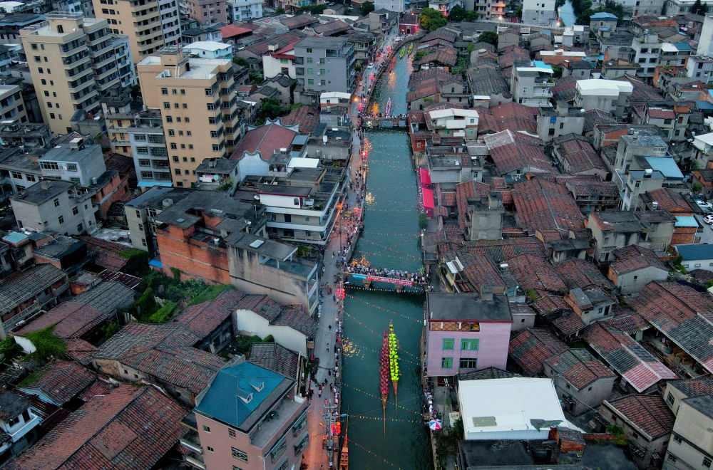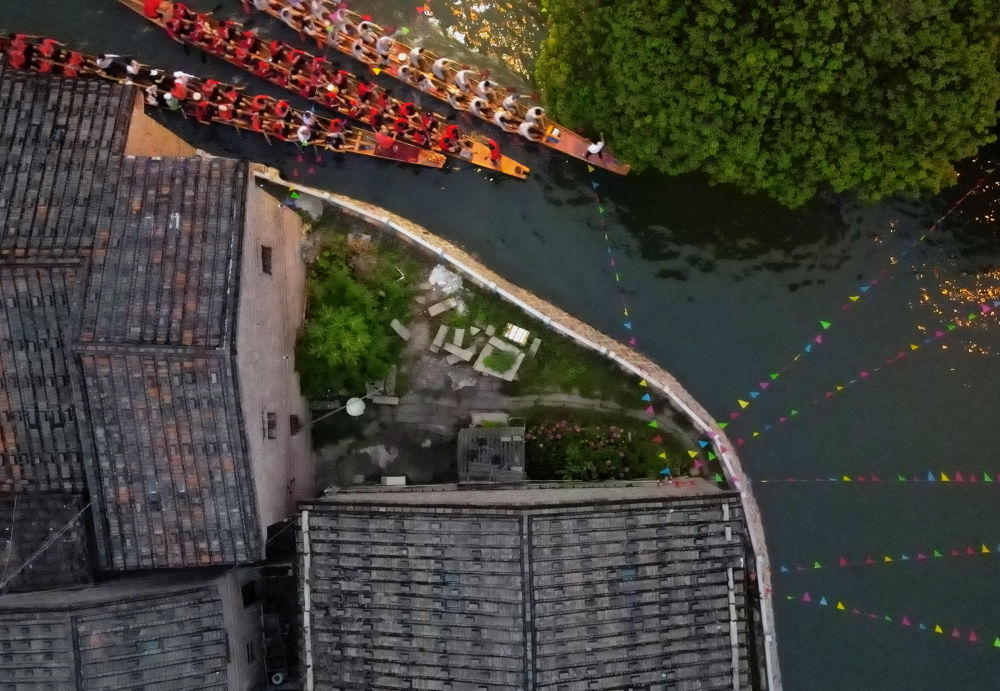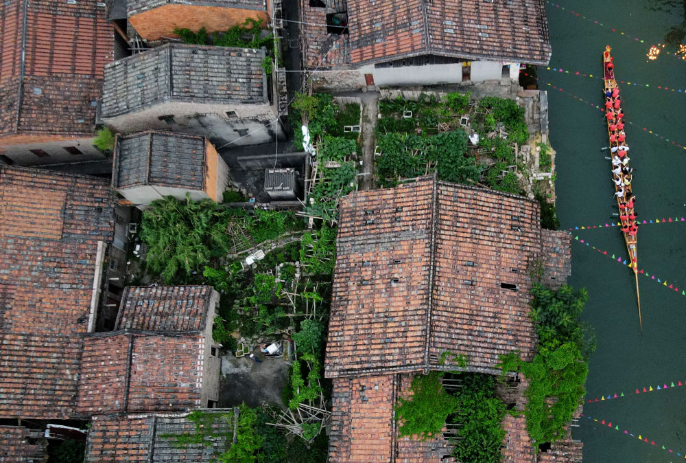 龙舟驶过三溪村成片古宅(无人机照片,6月11日摄)。