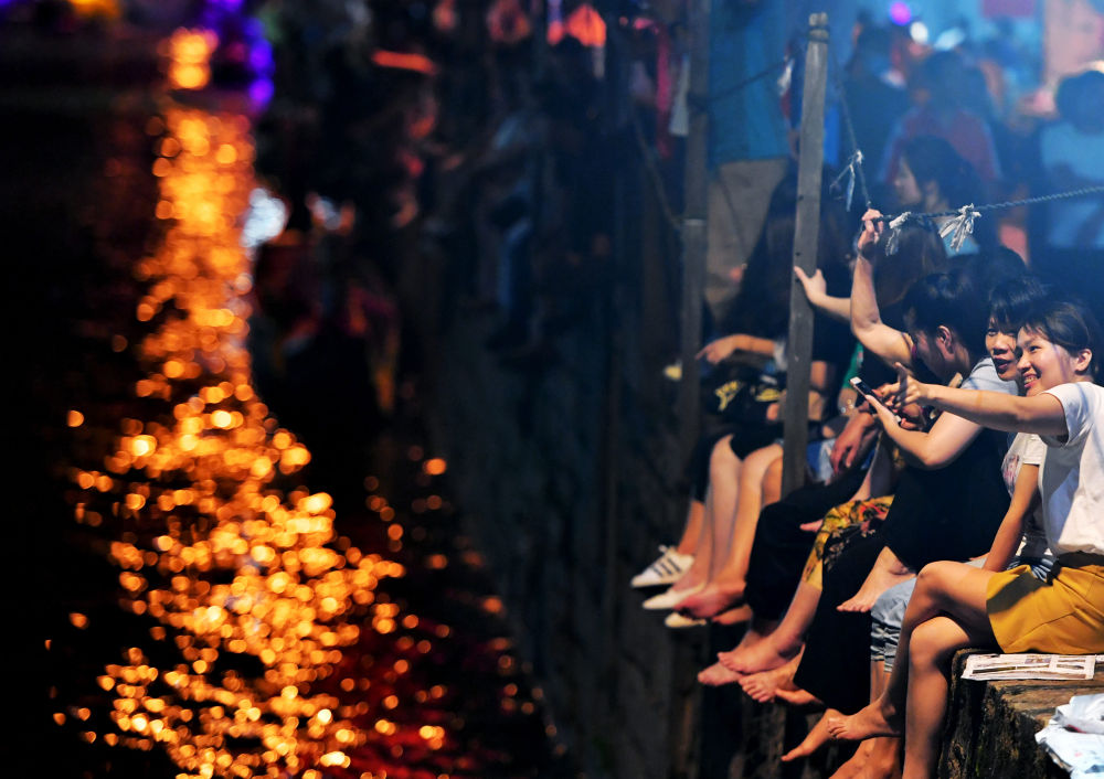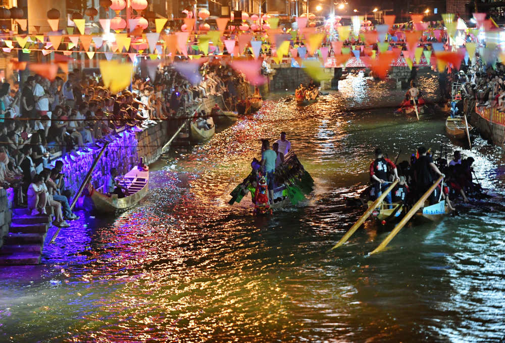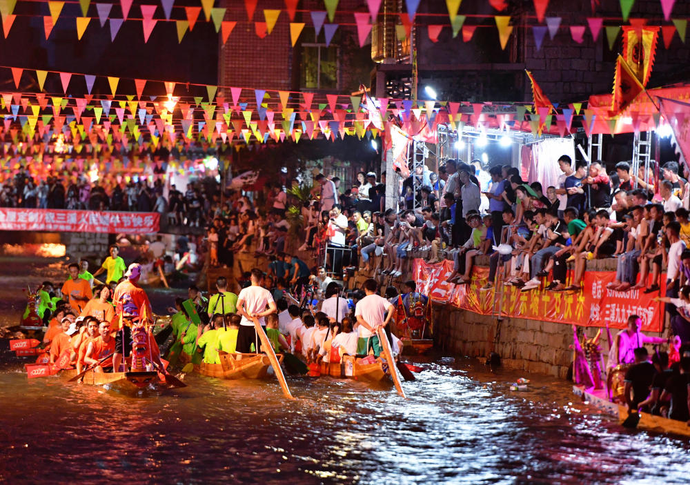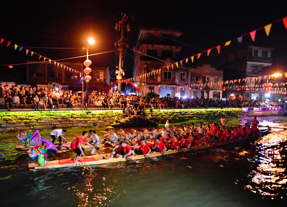 夜色降临,华灯初上,村里灯光辉映,溪中龙舟竞发,南溪两岸及石桥上人潮如涌,热闹非凡,吆喝声、加油声、喝彩声此起彼伏,夜色中的三溪村变成一片欢乐海洋。
