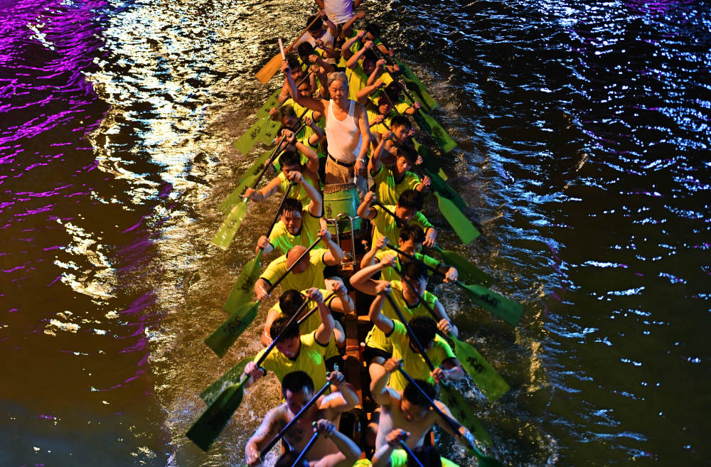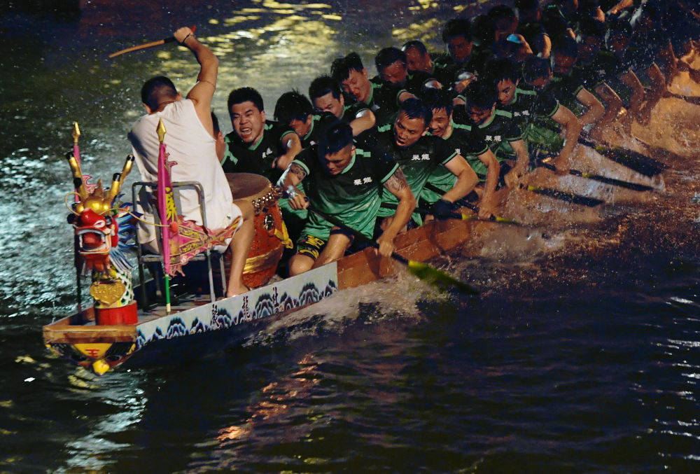夜色中的三溪村溪面上,龙舟选手们奋力划桨(6月10日摄)。