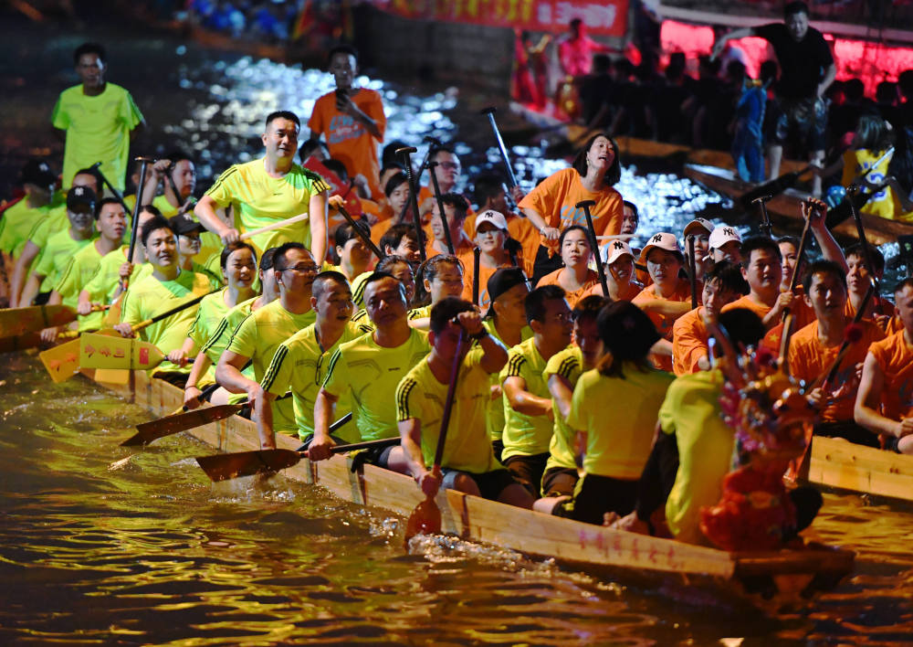 三溪村夜赛龙舟活动现场(6月11日摄)。