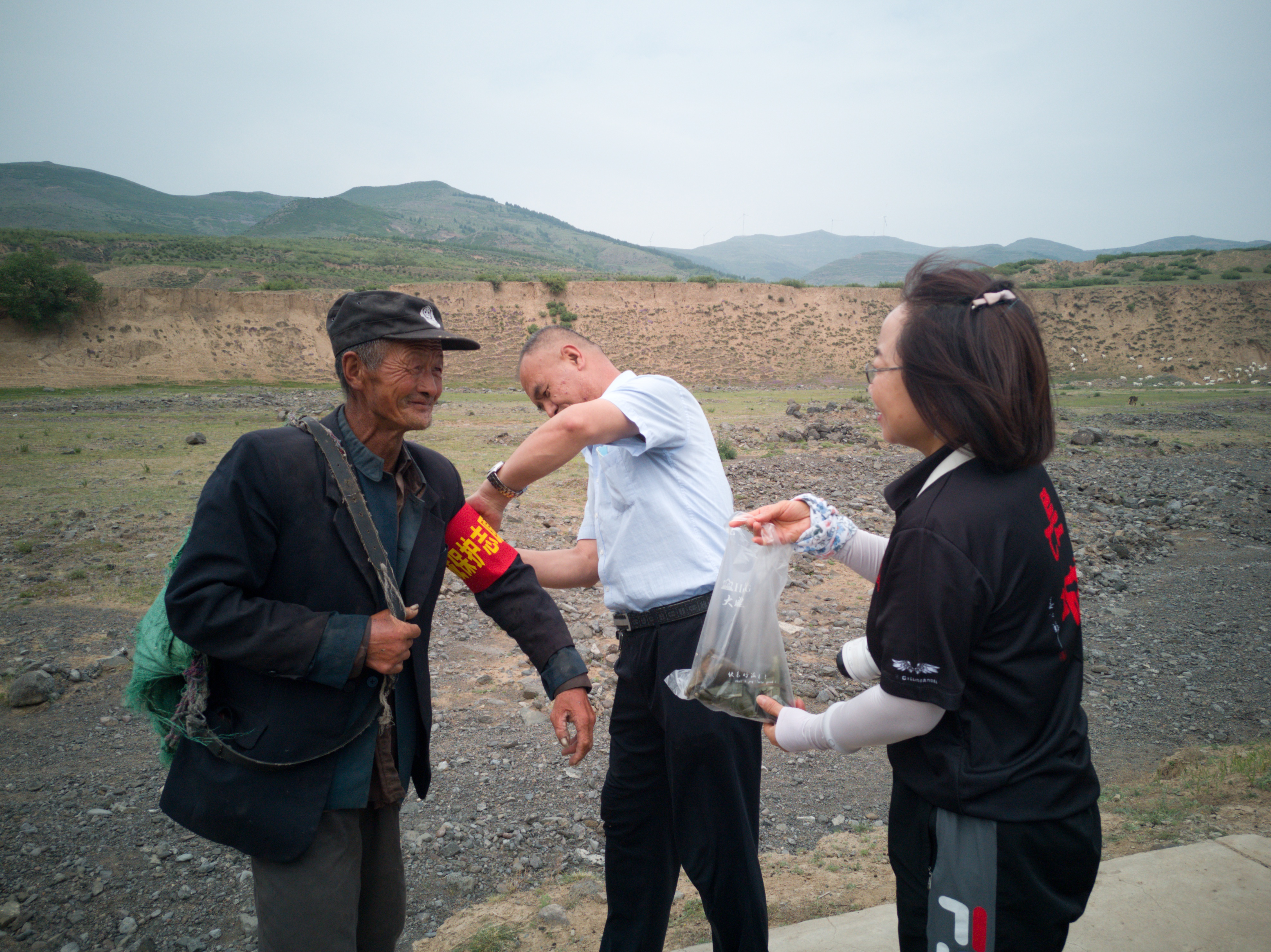 志愿者给羊倌发放红袖章和粽子。受访对象袁建琴提供