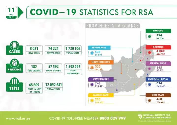当地时间6月11日南非卫生部确认南非当天新增新冠肺炎确诊病例8021例,累计确诊1730106例,南非全国已检测12092681人,当日检测48609人。当日新增182例新冠肺炎死亡病例,目前南非共57592人因新冠肺炎去世。至今为止共1598293例康复。(总台记者 周涛)