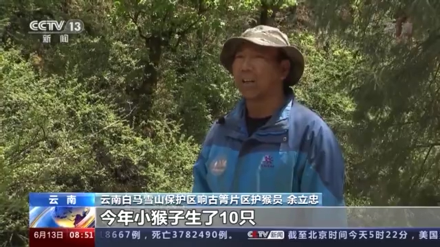 云南白马雪山保护区响古箐片区护猴员 余立忠:今年小猴子生了10只,最后那一只是红点家的,一个月不满,今年红点家就生了3只。
