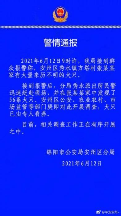 接到报警后,分局秀水派出所民警迅速赶赴现场,并在张某某家中发现了56条犬只。安州区公安、农业农村、市场监管等部门庚即对此开展调查,犬只已由专人看养。