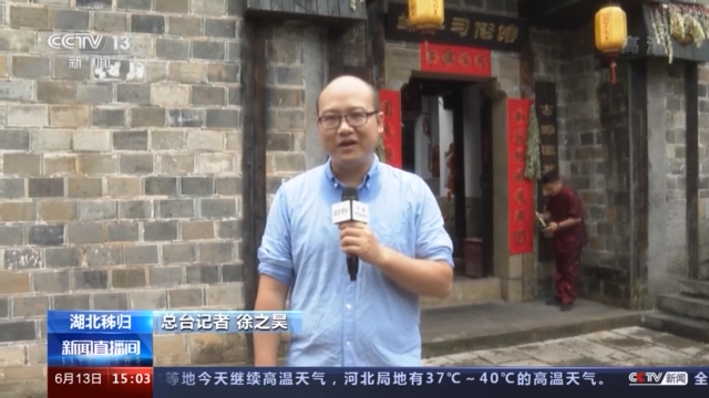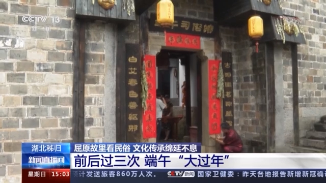 总台记者 徐之昊:我现在所在的地方,就是屈原的故乡,湖北宜昌秭归。在我的身后,是这里的端午习俗馆。我们看到有人在门口正在贴对联,这个叫端午联。因为秭归长期以来一直有着一种说法,叫“端午大过年”,所以在端午的时候也要贴对联。不仅如此,这里的端午前前后后一共要过三次。从农历五月初五开始,过“头端阳”;到五月十五,过“大端阳”;五月二十五,过“末端阳”,总共持续将近一个月的时间。