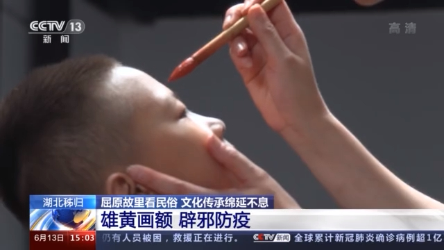 总台记者 徐之昊:过去南方在端午节前后的时节,很多地方又热又湿,蚊虫肆虐,瘟疫疾病容易蔓延。而雄黄被古人们认为具有辟邪防疫的作用,因此到了端午节,秭归的人们会用雄黄酒涂抹在小孩子额头上,画一个“王”字。意在消毒防病,蚊虫不叮。
