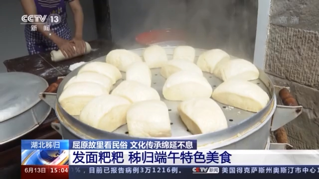 总台记者 徐之昊:这一种特色的美食叫发面粑粑,是用端午前后新收割的小麦,用古法加工,然后蒸熟制作而成的。到端午节,秭归的人们要全家人围在一起来吃发面粑粑。