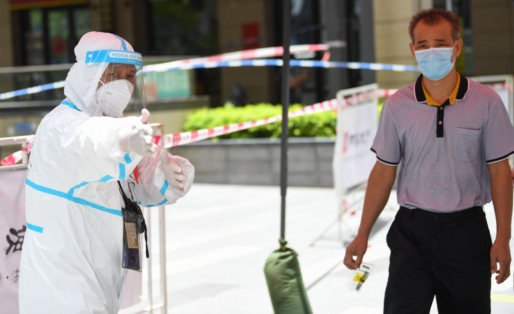 △6月12日,在广州荔湾区白鹤洞街广钢新城,防疫志愿者指引居民前往核酸检测。