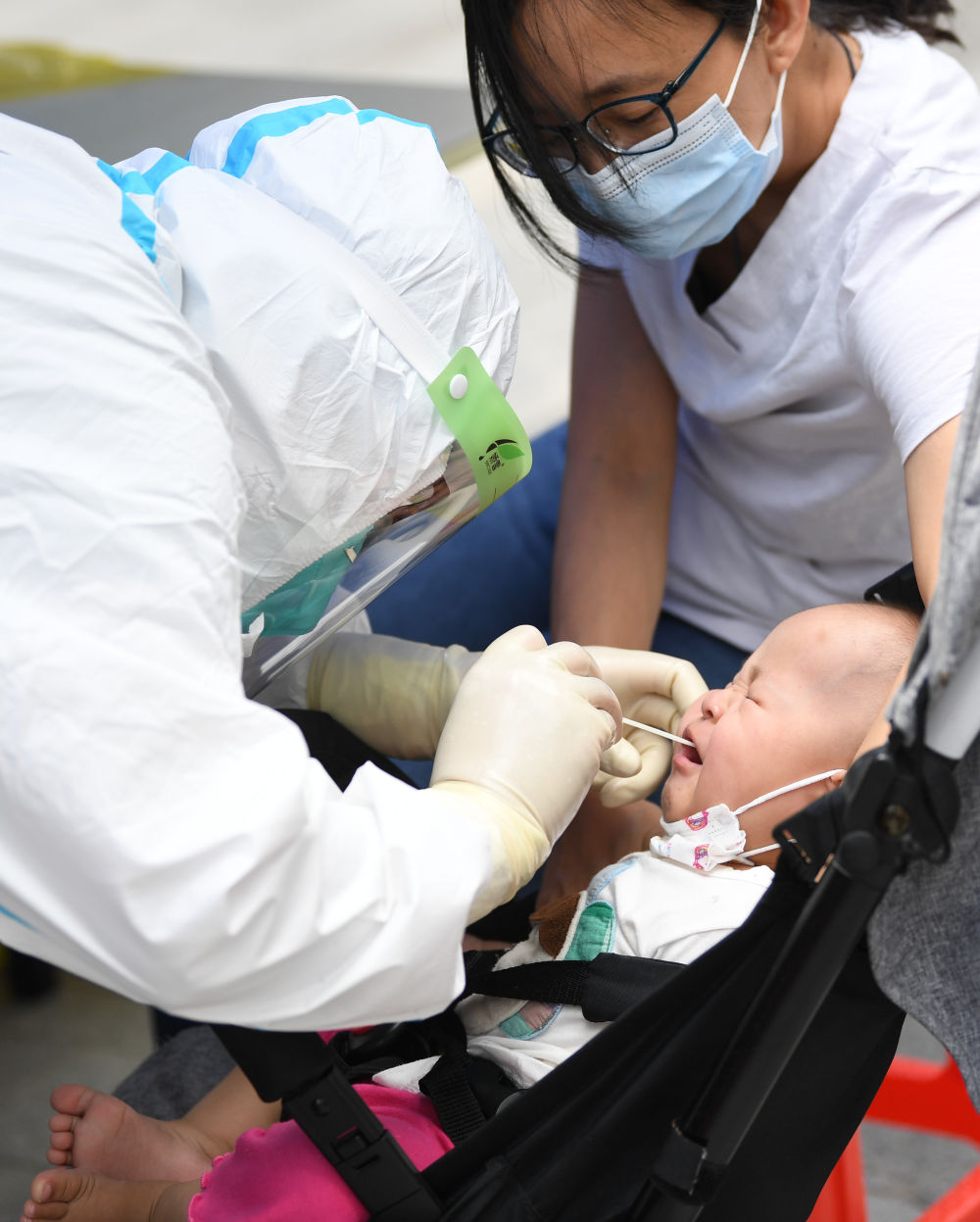 △6月12日,在广州荔湾区白鹤洞街广钢新城,医务人员为幼儿进行核酸检测采样。