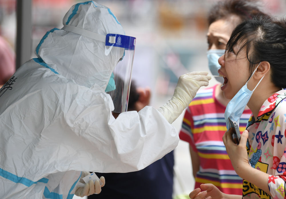 △6月12日,在广州荔湾区白鹤洞街广钢新城,医务人员在进行核酸检测工作。